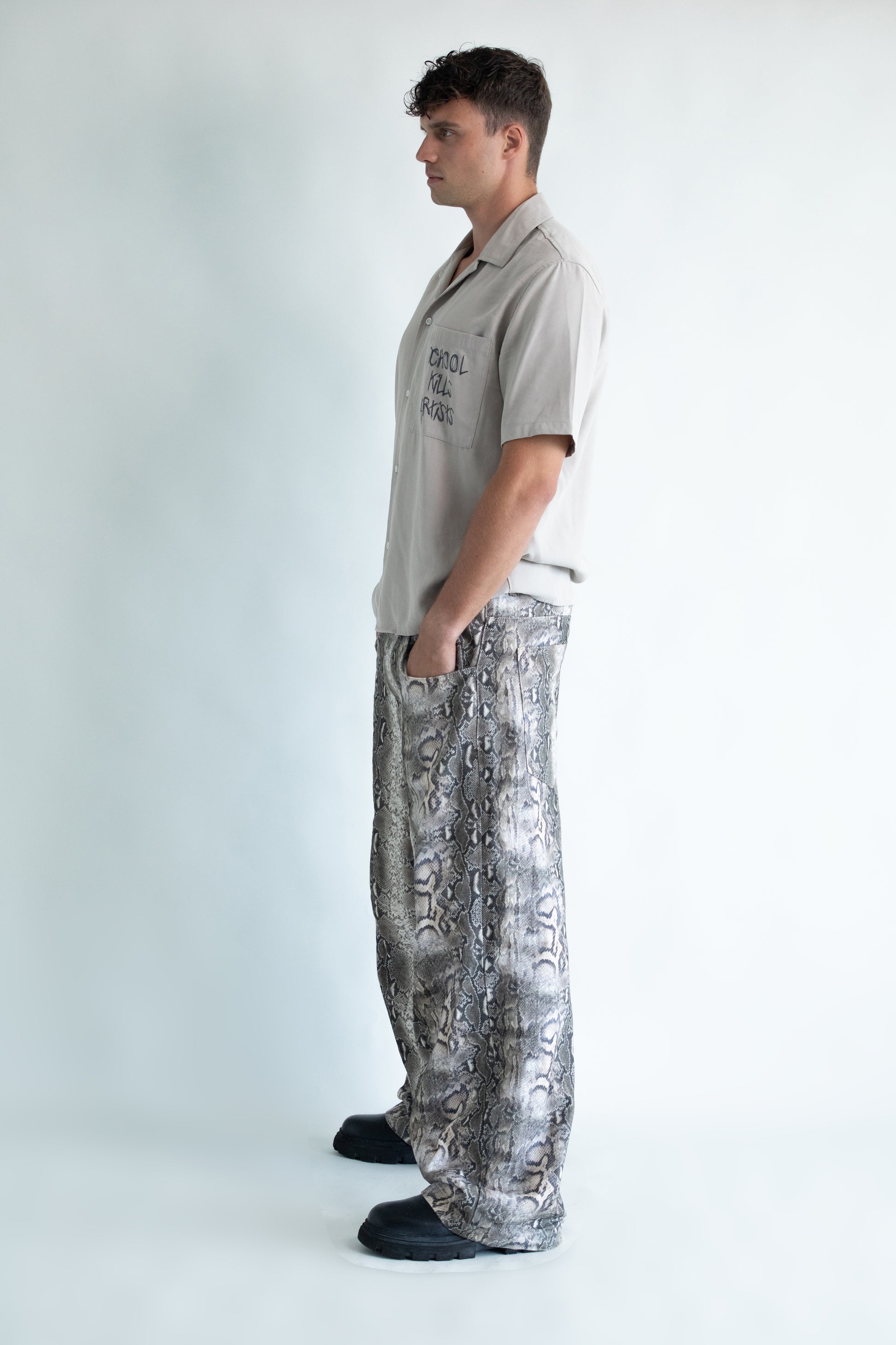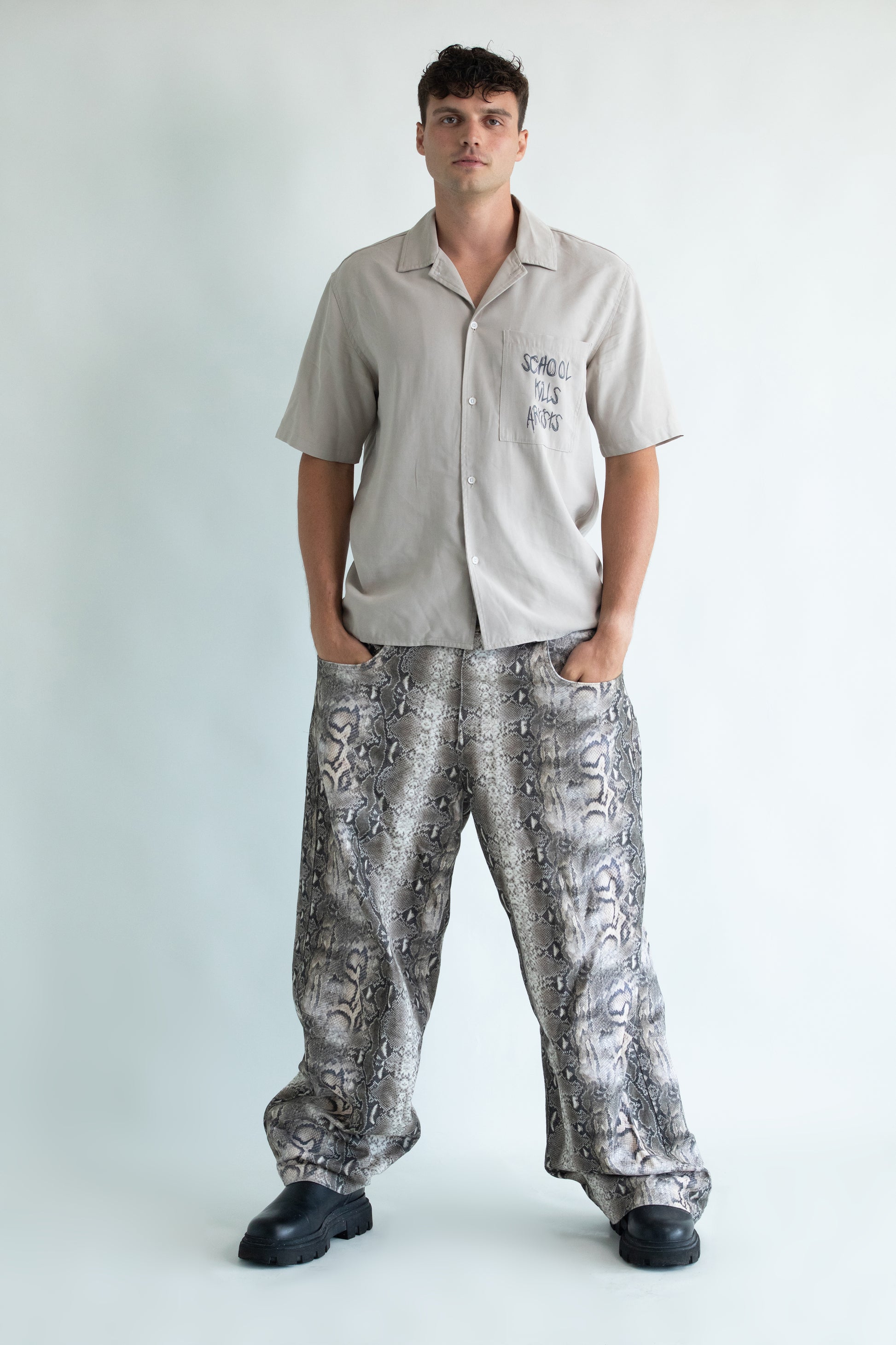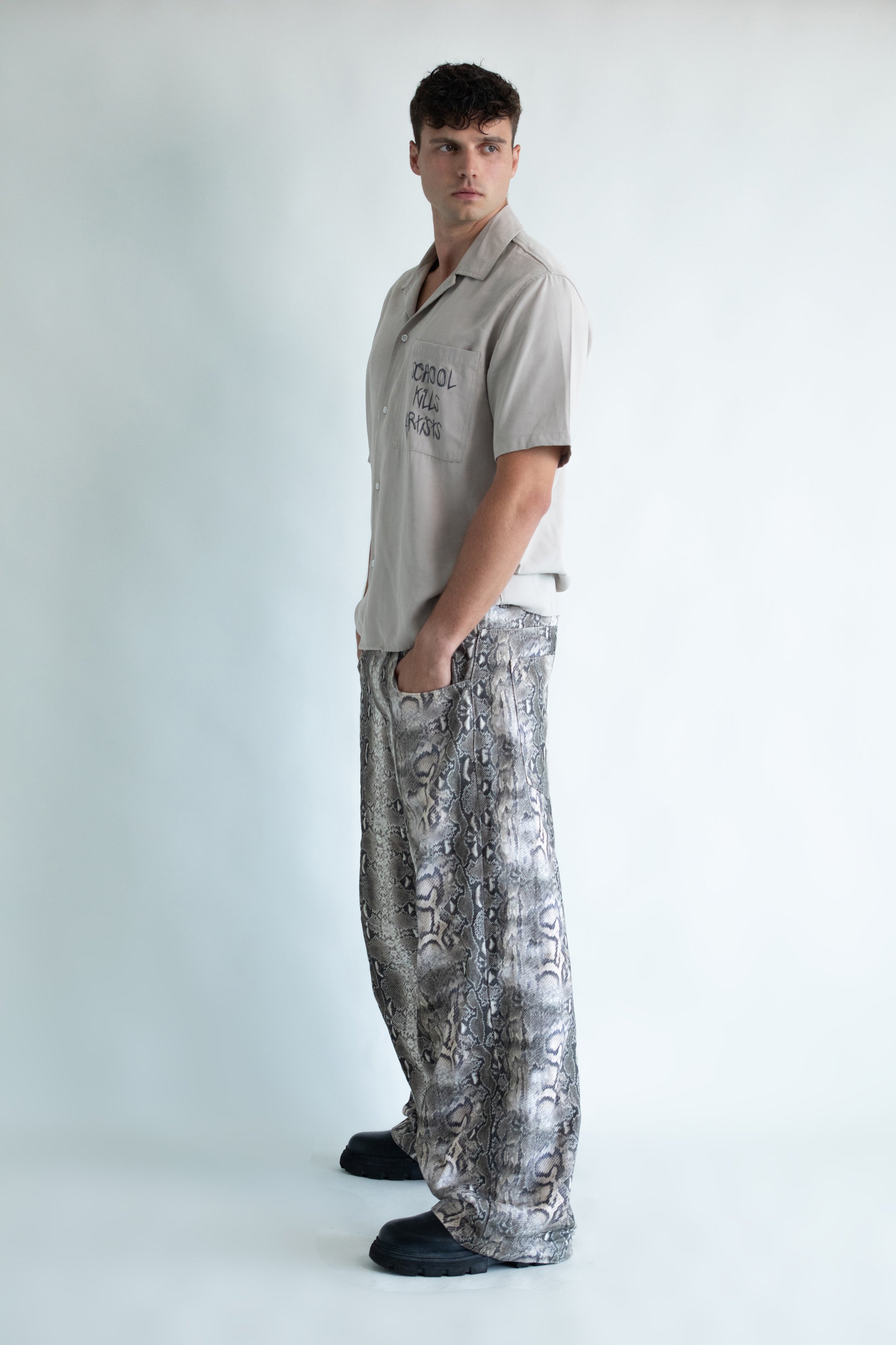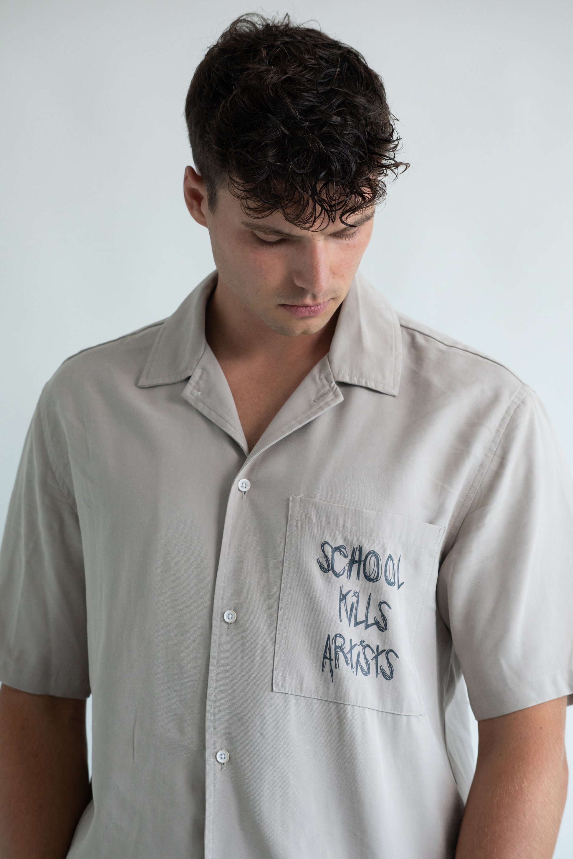 Das School Kills Artists Kurzarmhemd ist ein rebellisches Statement innerhalb einer Kollektion, die von den philosophischen Prinzipien des Perennialismus inspiriert wurde. Das Hemd steht für den inneren Künstler, der in jedem von uns lebt und fordert dazu auf, diese kreative Flamme am Leben zu erhalten und gegen konventionelle Normen zu rebellieren.
