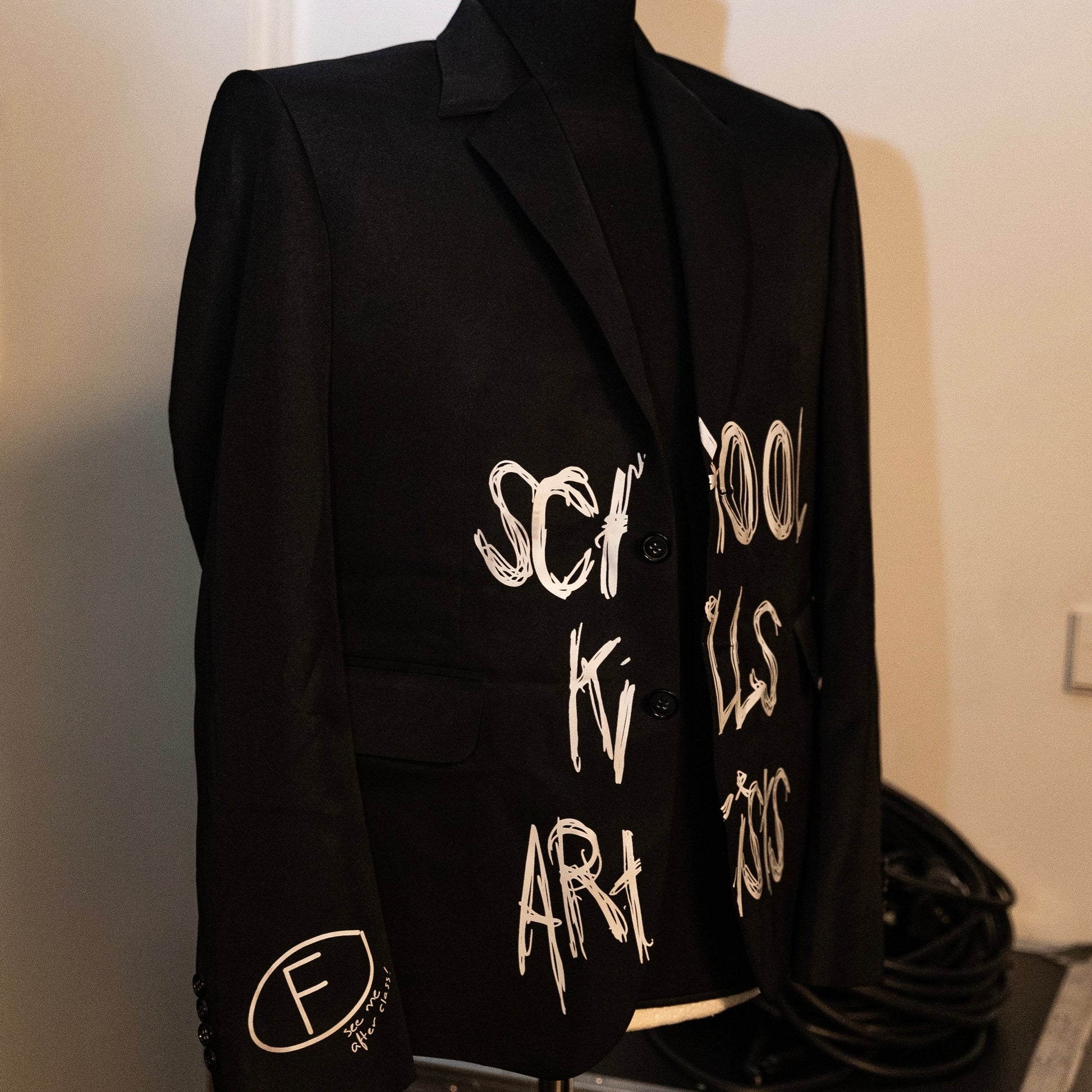 Hochwertiger Unisex Blazer in Schwarz mit weißem Siebdruck auf der Vorderseite.